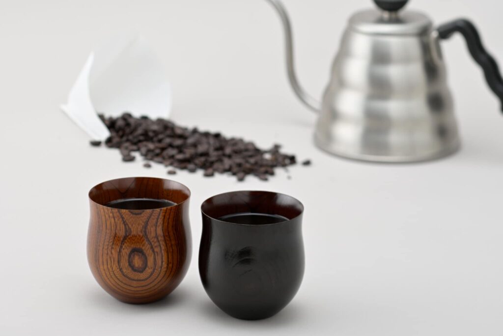 「うすくちうるし」は、飲み口が厚さ約1㎜の漆塗りの木製食器です。薄く研ぎ出し、漆を塗り重ね、やさしくすっきりとした口当たりに仕上げました。木製なので、ガラスや陶磁器の薄口食器よりも割れにくい点で優れています。また熱が伝わりにくい特性を生かし、珈琲のぬくもりを手のひらで感じながら、味わうことができます。